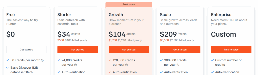 | Large team, email focus | Hunter.io Scale | $2,508/year for 300K credits, unlimited users |