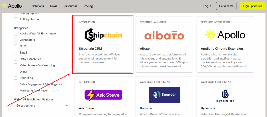 • Connect Apollo.io with ShipChain SCM’s API: In Apollo.io, navigate to the CRM integration section and look for ShipChain SCM. Use the API keys provided by ShipChain to establish the connection between the two platforms.